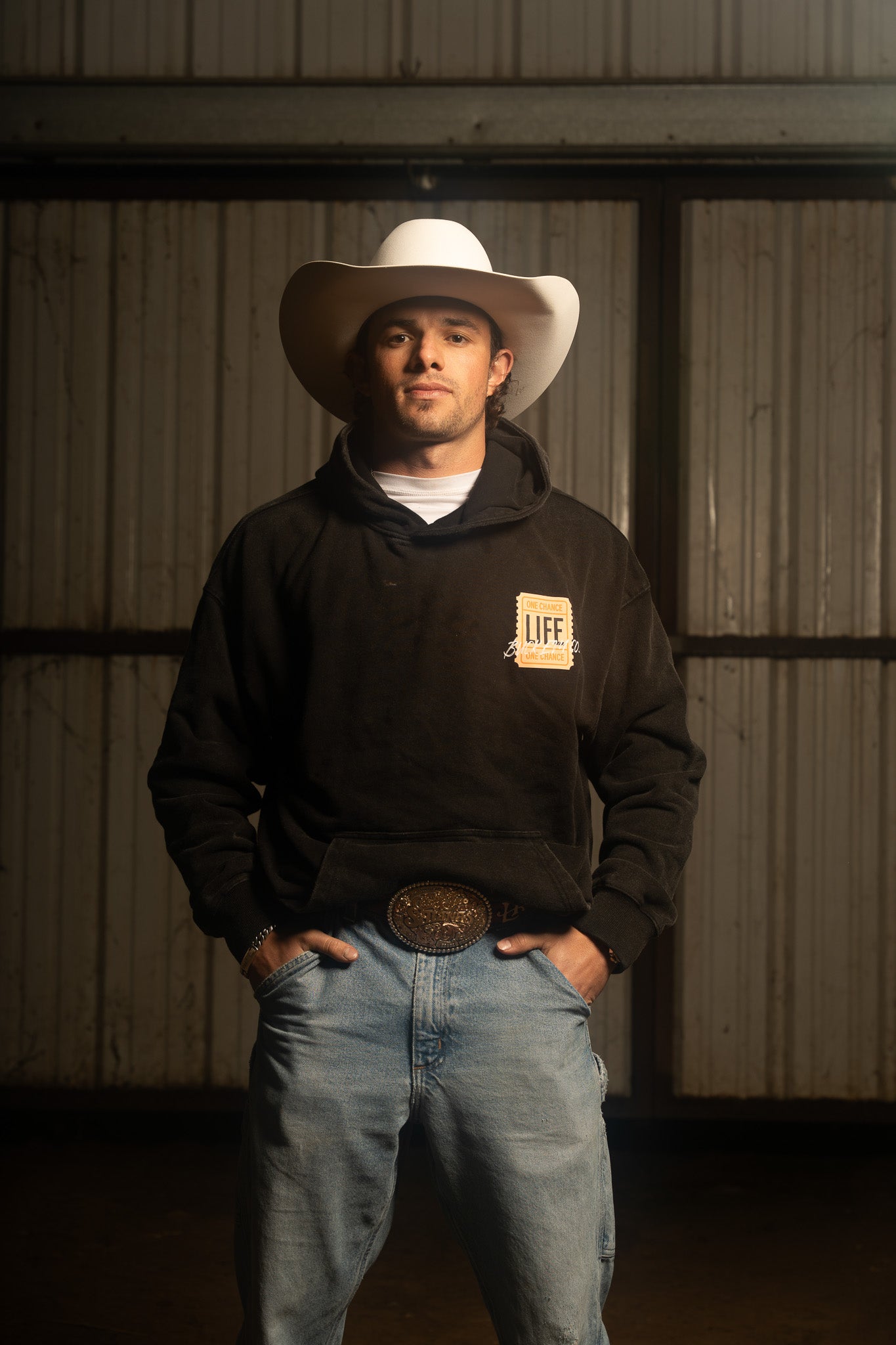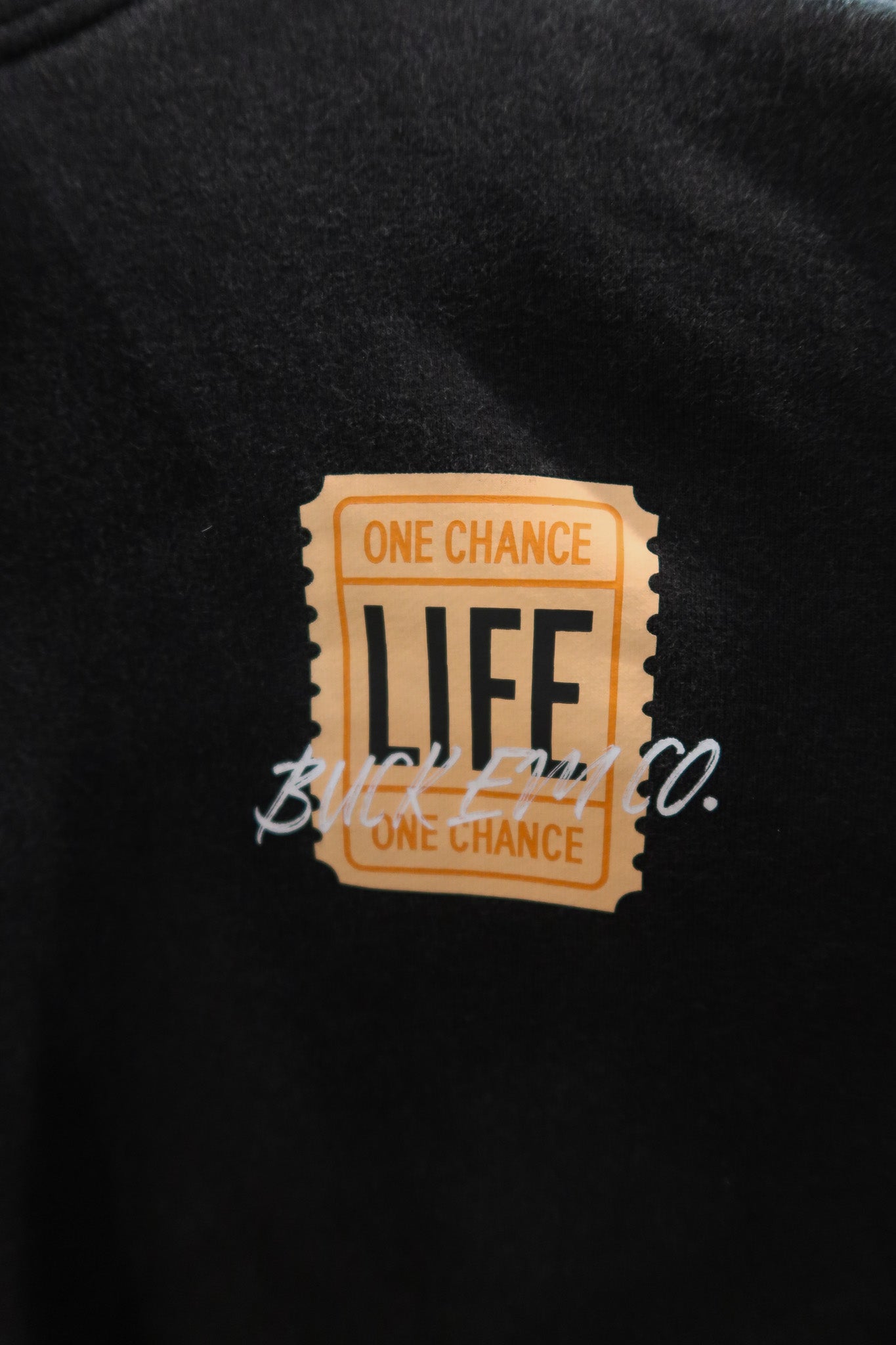 Washed, black hoodie. Relaxed fit. Medium weight. One chance at Life - Don't look back!